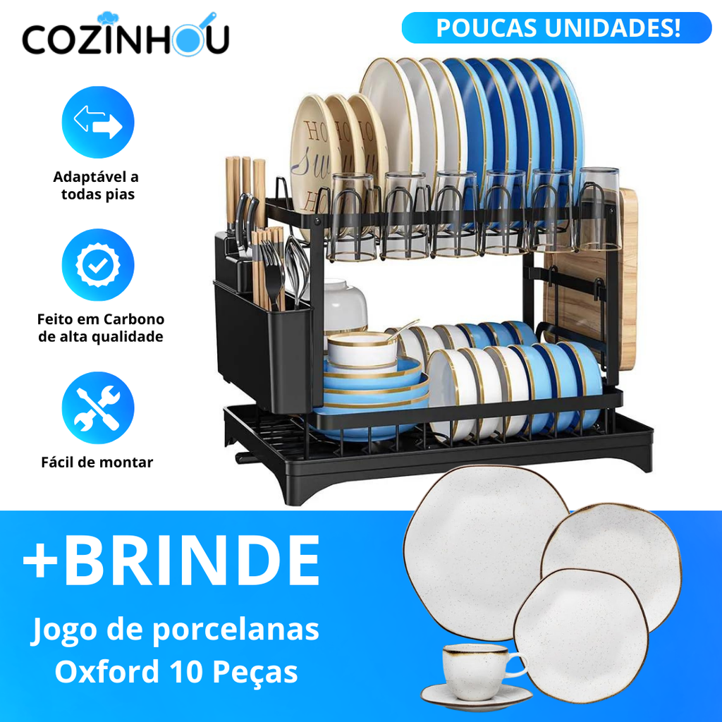 Escorredor de Pratos e Talheres em Carbono + Brinde Exclusivo ( Jogo de porcelana Oxford 10 Peças )